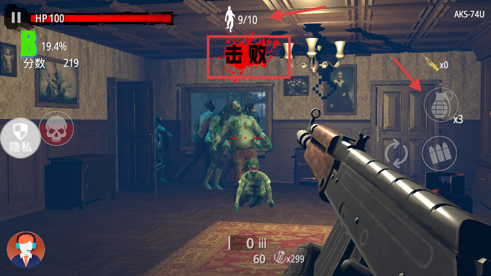 3、击败僵尸后,利用【手榴弹】清理集群僵尸,提升分数,关注剩余目标数,高效推进。