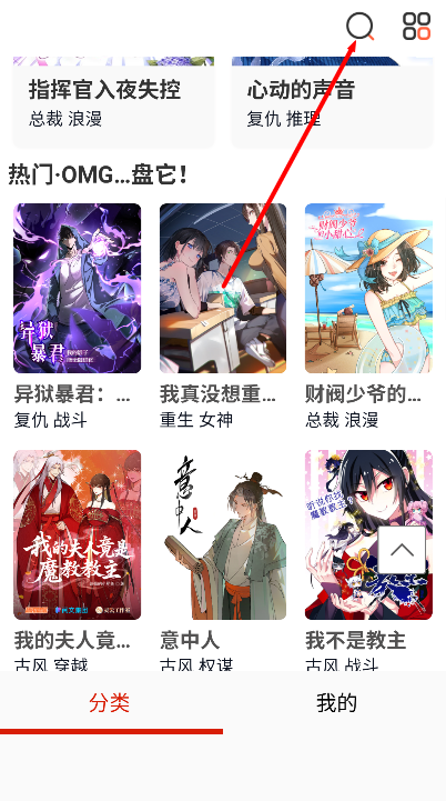 1、打开安装完成的《绅士图书馆》后,进入首页界面,点击右上角的搜索按钮,即可进入搜索页面,在这里可以查找想要阅读的动漫内容。