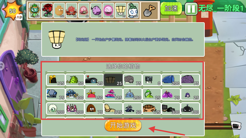 2、在植物选择界面,依阳光与僵尸类型选植物,点击【开始游戏】开启战斗。