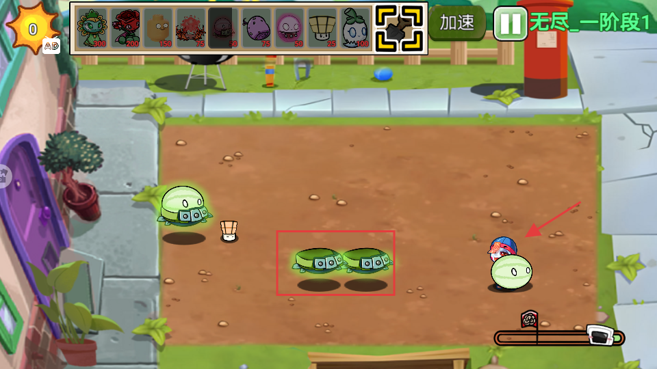 4、合理种植变异植物(如【西瓜】),搭配防御植物,利用技能击退入侵僵尸。