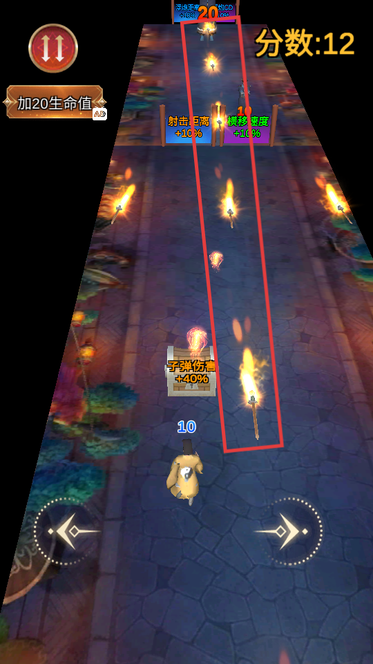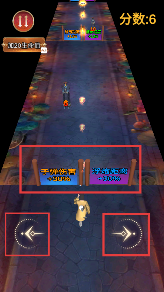 2、游戏过程中,利用屏幕下方左右的【方向键】走位,优先选取【子弹伤害+30%】【浮炮距离+30%】等增益道具提升战力。