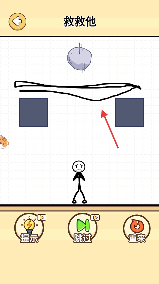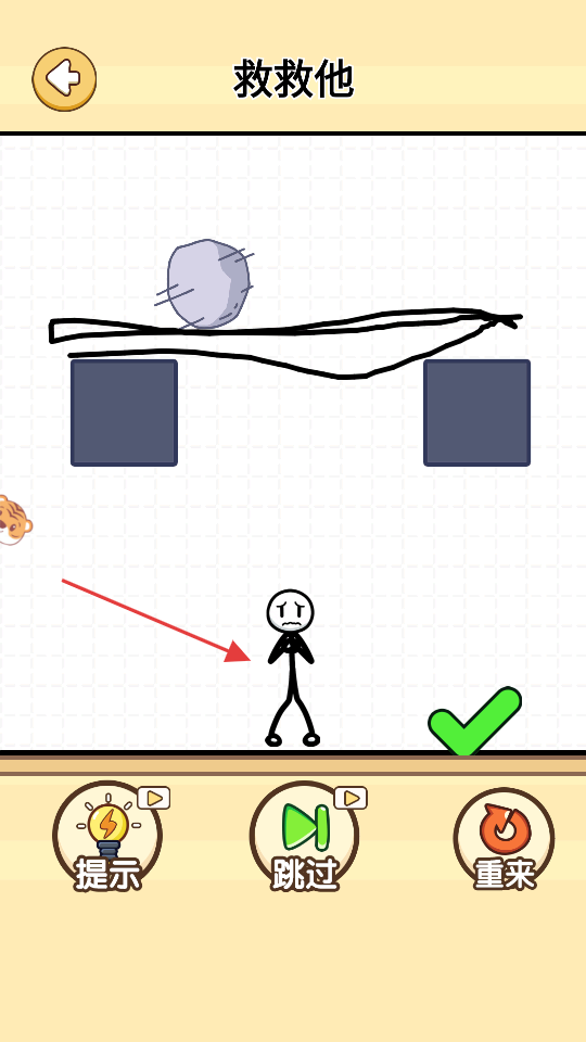 3、石头落线条上后,火柴人安全,点击右侧【√】,验证方案成功,推进关卡。