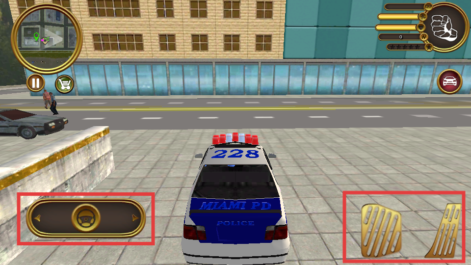 4、成功上车后,通过左侧的【方向盘按钮】操控警车方向,右侧的【踏板按钮】控制警车的前进和后退。