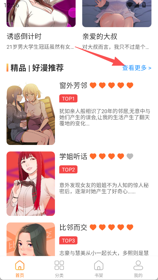 1、首页“精品/好漫推荐”板块可点击“查看更多”,浏览更多漫画。