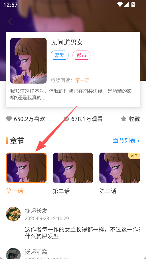 3、漫画详情页整合多类信息,不仅展示作品的喜欢数、观看数,还呈现章节列表与用户评论,全方位呈现漫画相关内容。