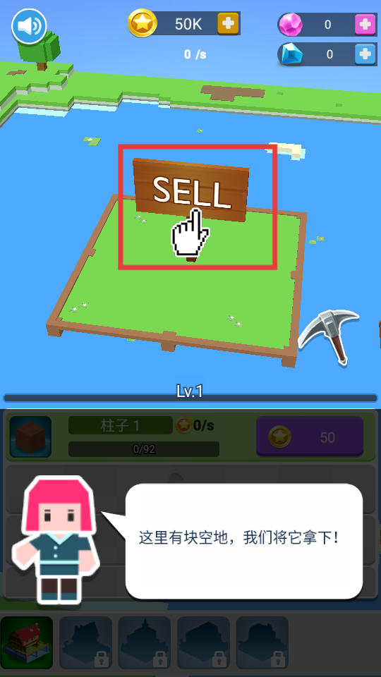 1、点击标有【SELL】的木牌,拿下空地,开启建筑经营流程。