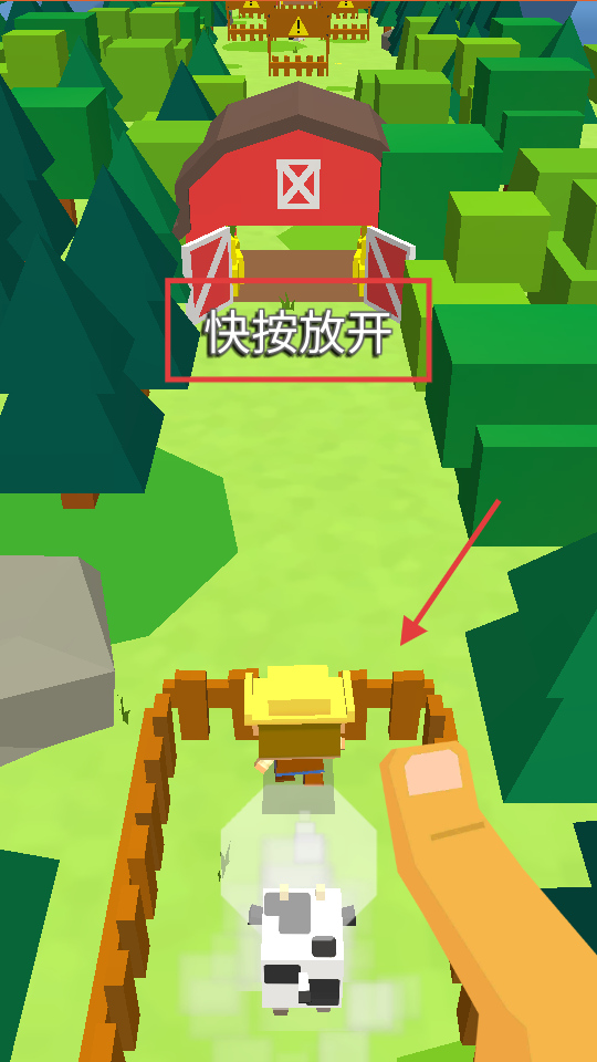 2、出现【快按放开】提示,按住后及时松开,让角色(带牛)跳跃通过红色门,掌握跳跃。