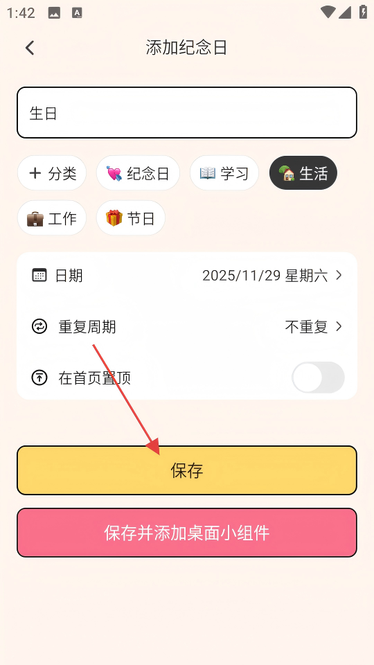 4、保存后,“倒数日”页会显示该纪念事件及倒计时天数。