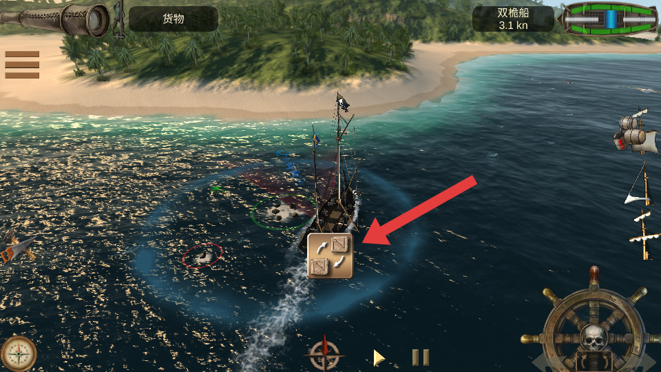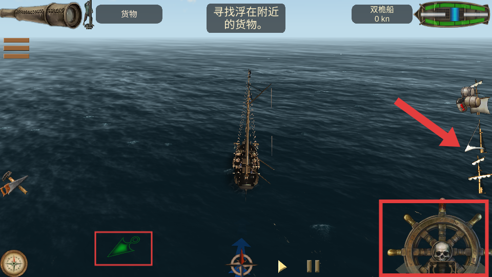 1、进入游戏,依据【寻找浮在附近的货物】提示,点击箭头所指【帆】开始扬帆,通过右下角【船舵】操控船只移动,前往箭头所指位置。