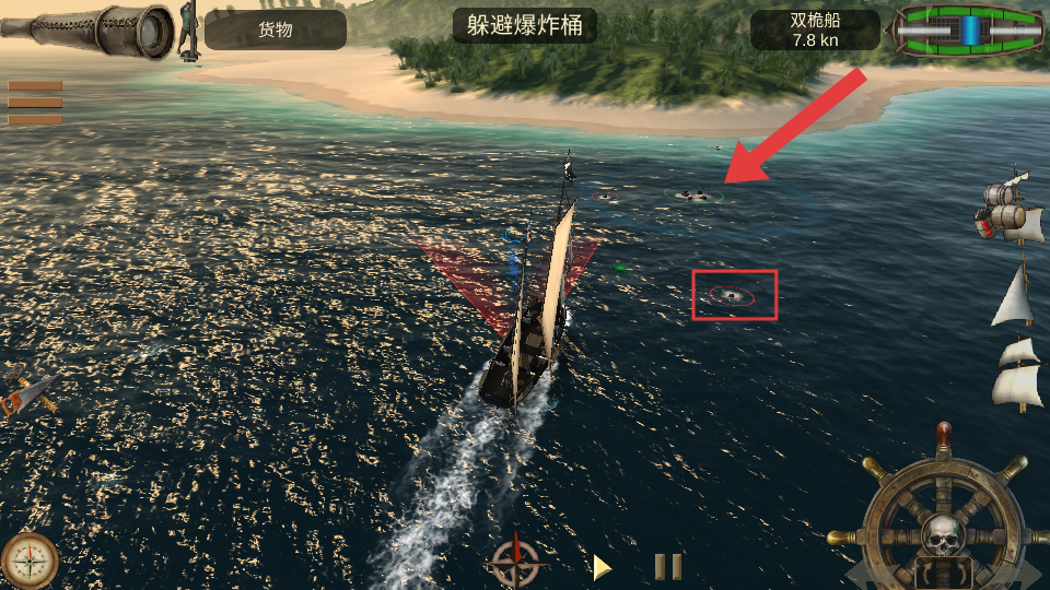 2、航行时留意海面,看到方框内【爆炸桶】标识的物体,及时操控船只躲避,前往箭头拾取货物。