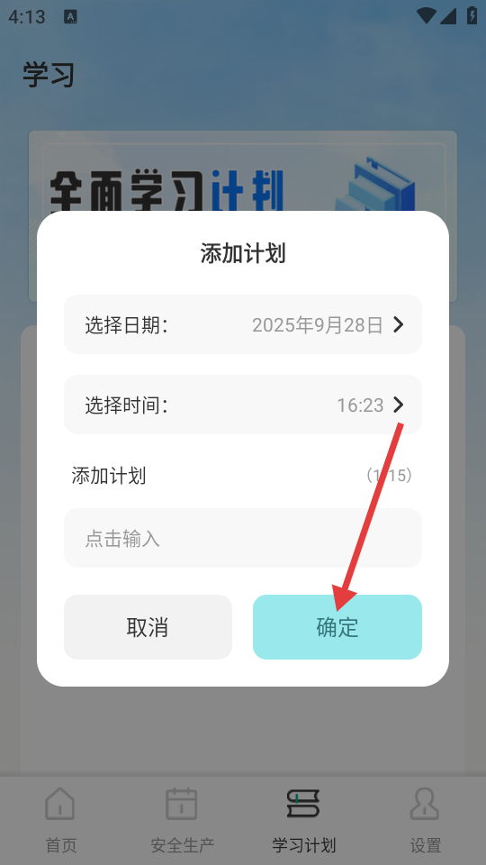 4、在添加计划窗口中,选择日期、时间并输入计划内容后,点击【确定】按钮,即可添加学习计划。