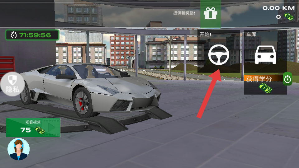 1、在游戏初始界面,点击带方向盘标识的【开始】按钮,进入驾驶场景。
