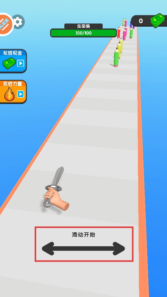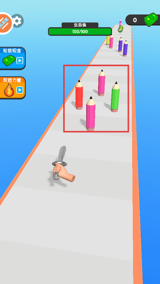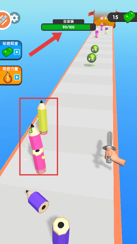 2、游戏开始后,操控角色前进,注意躲避赛道上类似【彩色铅笔】的障碍物,避免损失生命值。