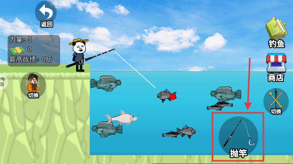2、观察水域鱼群分布,点击【抛竿】让鱼钩落至目标鱼旁,精准触发钓鱼机制。
