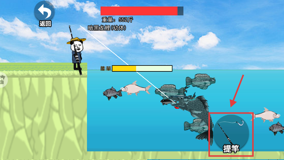 3、鱼上钩后点击【提竿】,开启遛鱼,关注鱼重【552斤】与能量条,消耗其体力。