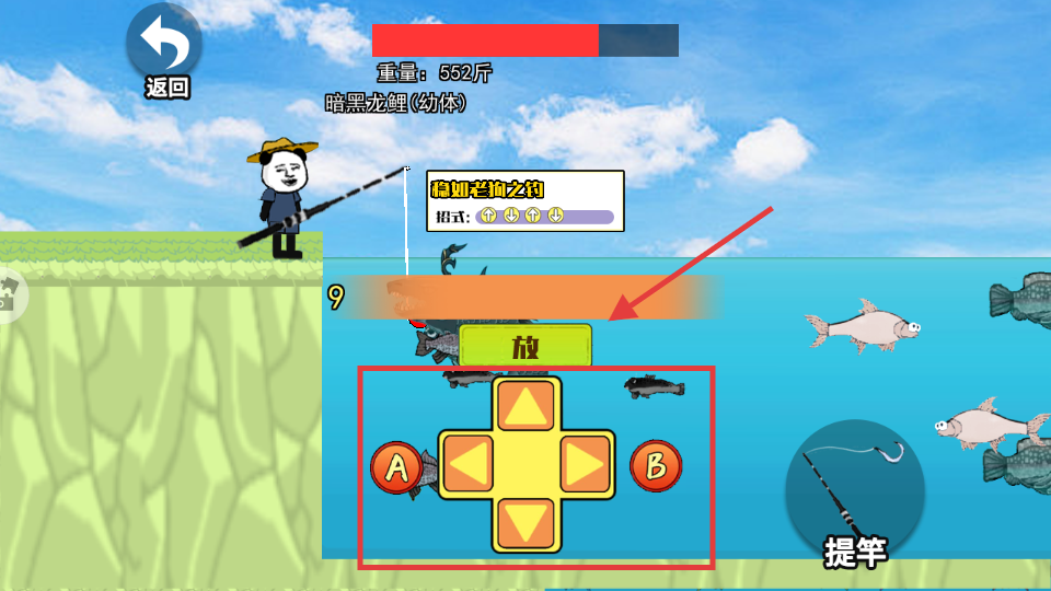 4、遛鱼时按招式提示,操作【方向键】+【A】-【B】按钮,把控节奏,避免鱼脱钩。