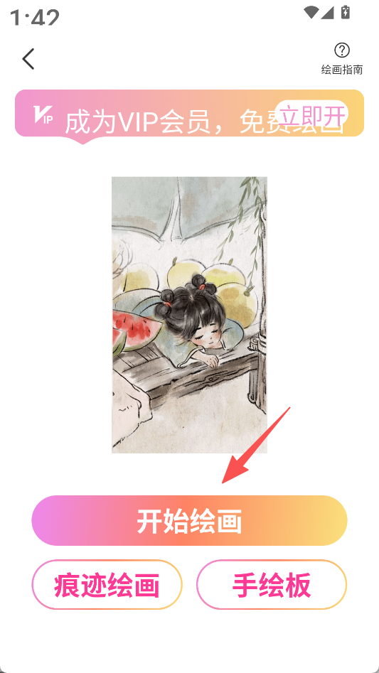 2、在绘画页面,点击“开始绘画”,选择痕迹绘画或手绘板进行创作。