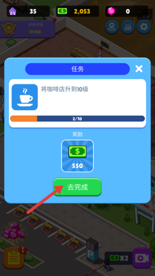 4、在任务界面点击【去完成】,推进将咖啡店升至10级的任务。