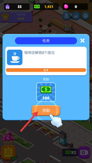 3、在任务界面点击【领取】,获取咖啡店解锁座位对应的500奖励。