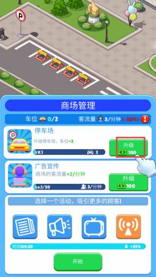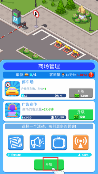 2、完成停车场升级后点击【开始】,启动商场运营,推进客流量的增长。