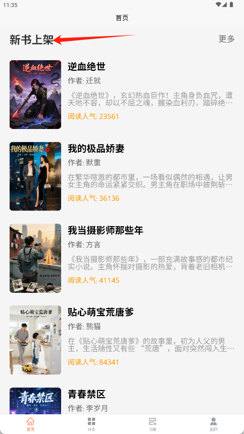 2、进入首页浏览“新书上架”等推荐板块,选择感兴趣的小说进入详情页。