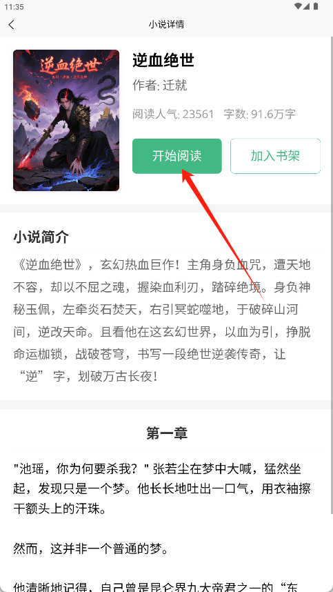 3、在小说详情页点击“开始阅读”按钮,即可立即阅读小说正文内容。