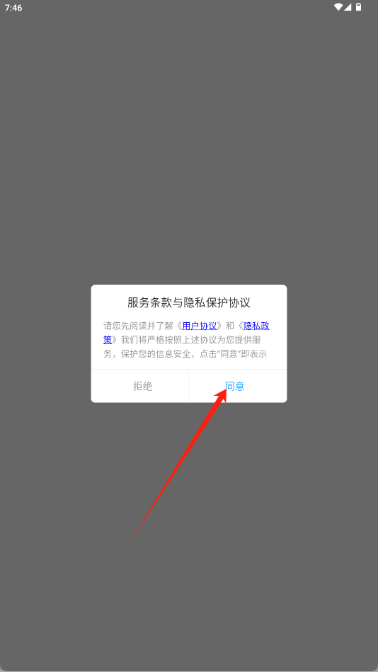 1、首次启动软件时,在服务条款弹窗中点击指示的“同意”按钮,完成协议确认。