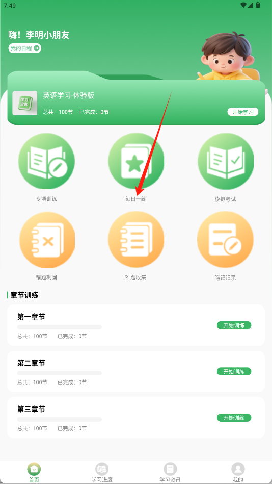 2、在学科主页找到“每日一练”功能图标,点击进入开始当天的练习任务。