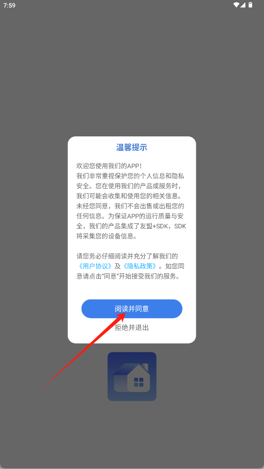 1、首次打开软件时,在隐私政策提示弹窗中点击指向的“阅读并同意”按钮。