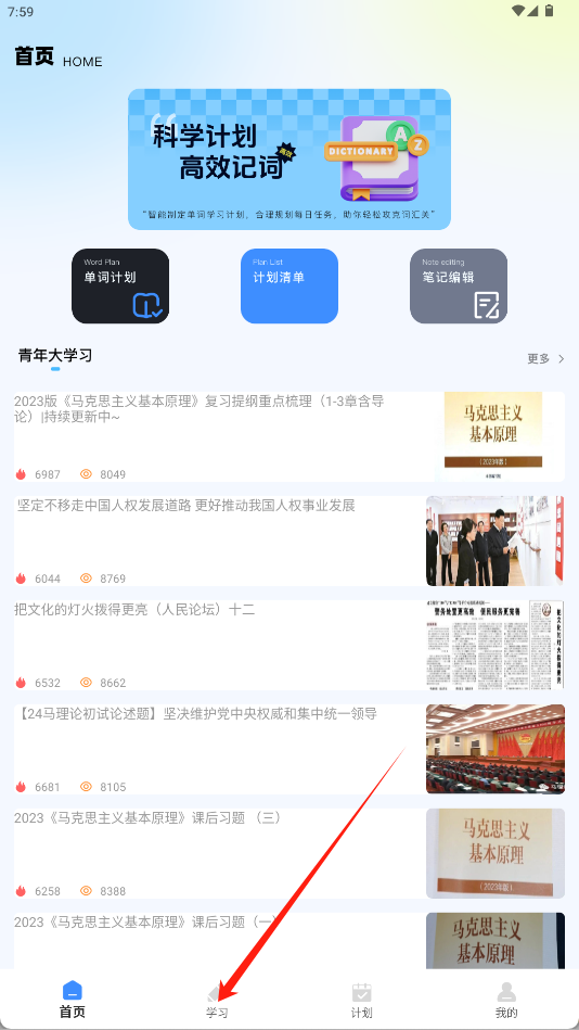 2、在首页底部导航栏找到并点击指示的“学习”功能选项。