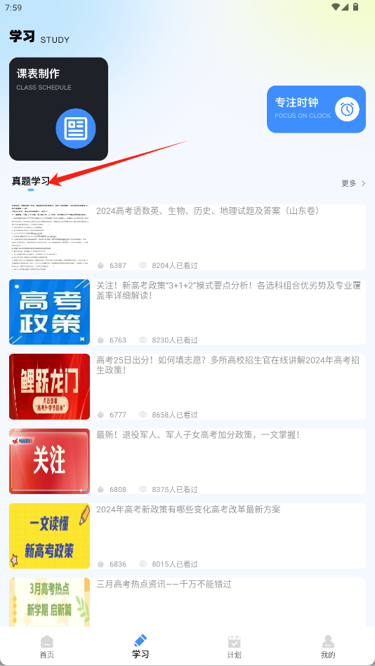 3、进入“学习”页面后,即可访问“真题学习”核心功能区。