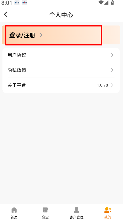 2、在个人中心中选择“登录/注册”,进入账号管理界面,准备进行身份验证和信息填写。