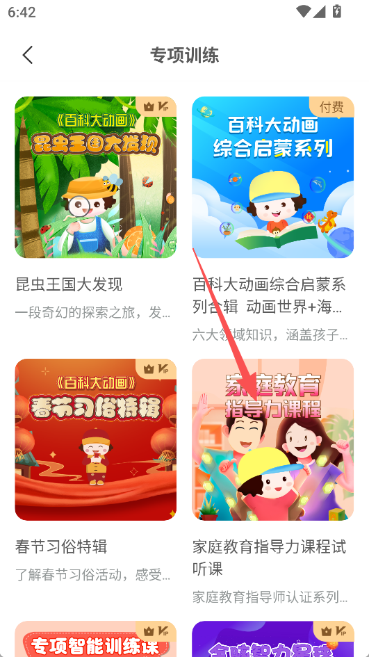 1、进入专项训练页面,可选择百科动画、家庭教育等课程,点击试听或加入学习,获取早教知识。