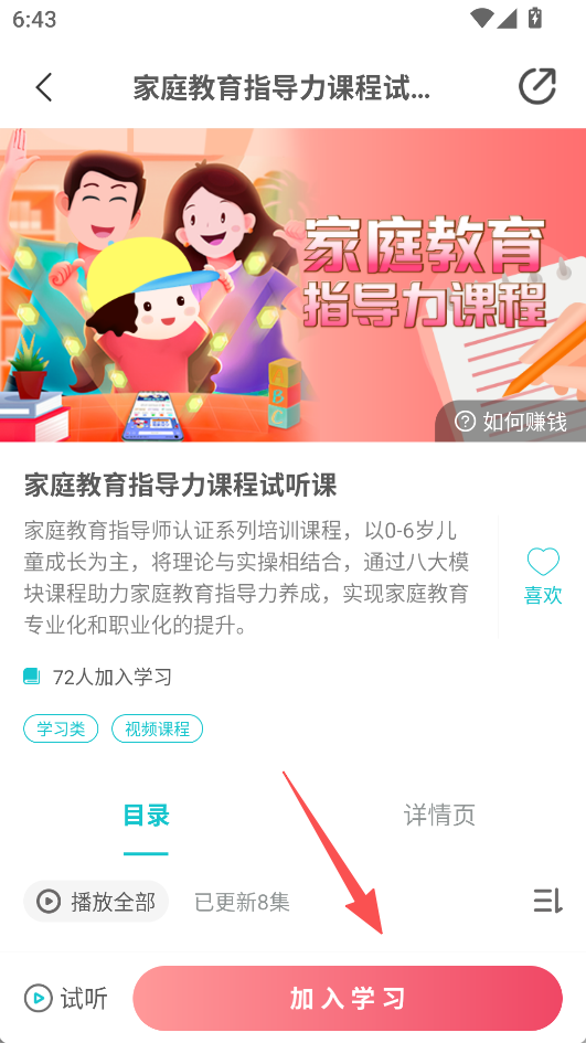 2、在课程详情页,点击“试听”或“加入学习”,开启课程学习。