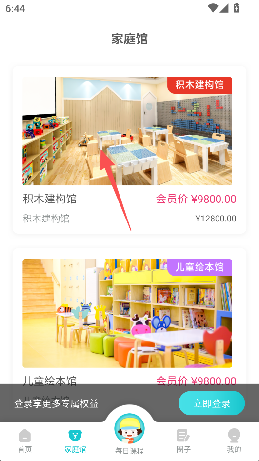 2、切换到家庭馆页面,能查看积木建构馆、儿童绘本馆等场馆的介绍及价格,了解线下服务内容。