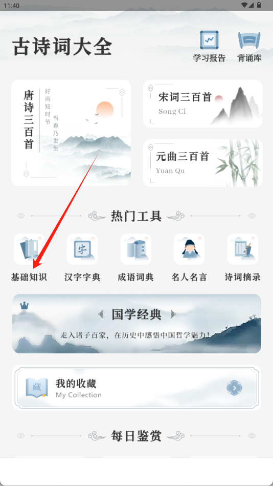 《古诗词网》是一款内容全面的古诗词学习软件。软件收录唐诗、宋词、元曲等大量经典作品,构成核心资源库。其特色在于将诗词学习与工具使用相结合,设有汉字字典、成语词典、名人名言等实用查询功能。用于追踪学习进度与强化记忆;“每日鉴赏”板块引导持续阅读。内容延伸至国学经典,涵盖诸子百家思想。界面清晰,便于系统学习传统文化,提升文学素养。