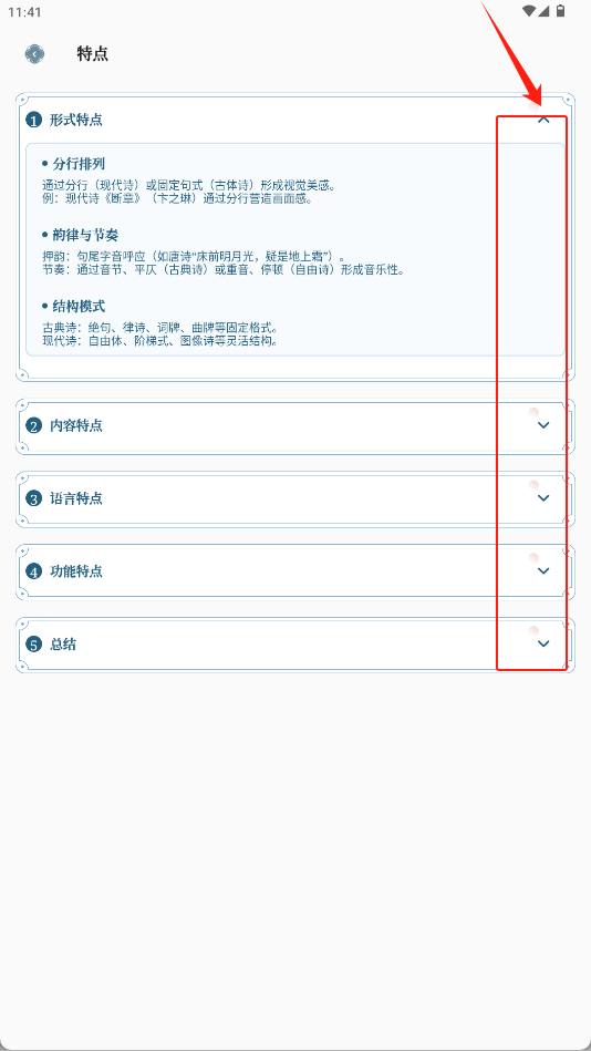 3、点击“形式特点”分类即可展开显示形式、内容、语言、功能及总结五个分类。