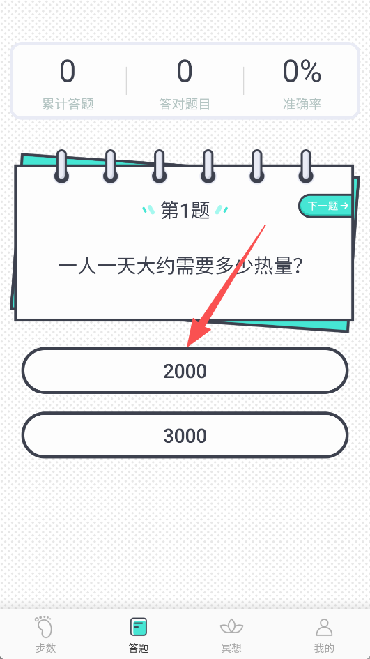 2、点击“答题”,能参与答题,了解一人一天大约所需热量等知识。