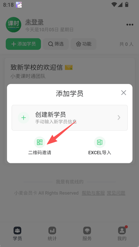 1、打开点击添加学员,可选择创建新学员、二维码邀请或Excel导入。