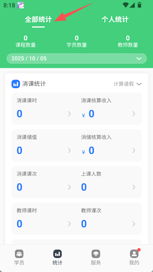 2、进入统计板块,可查看全部统计,了解课程、学员、教师数量等信息。