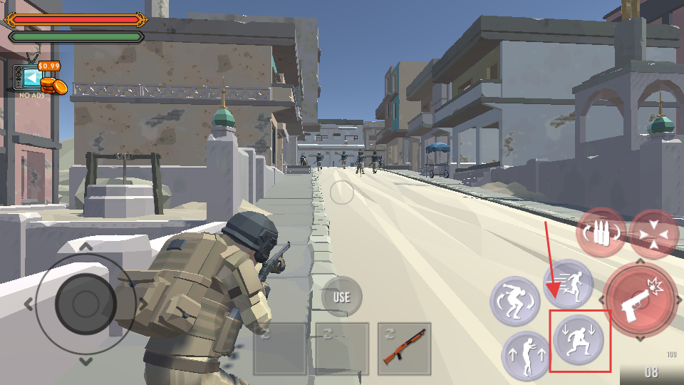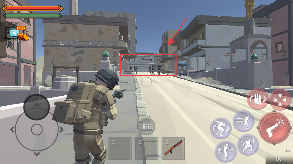 1、发现远处敌群,利用建筑掩护,切换【霰弹枪】准备迎击,留意血量状态。
