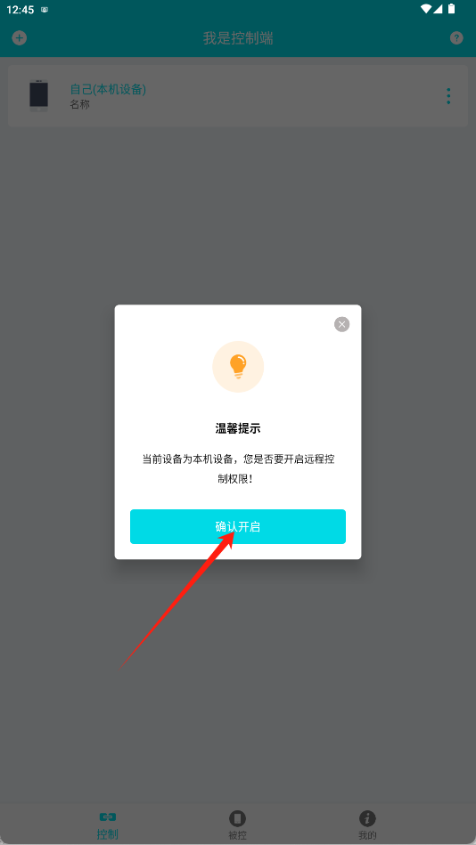 2、界面采用蓝绿色主题设计,底部设置控制、被控、我的三大核心功能模块,结构清晰明确。