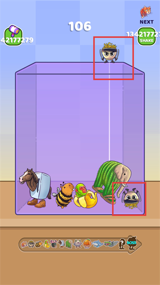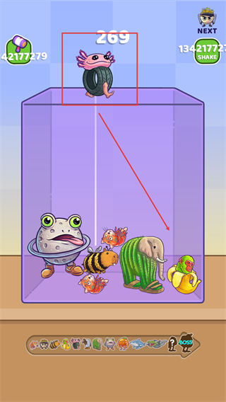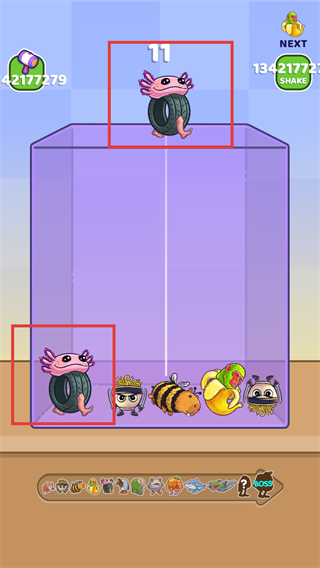 1、将顶部的【章鱼轮胎怪】拖至下方相同的【章鱼轮胎怪】处,完成合并升级以获取更高积分。