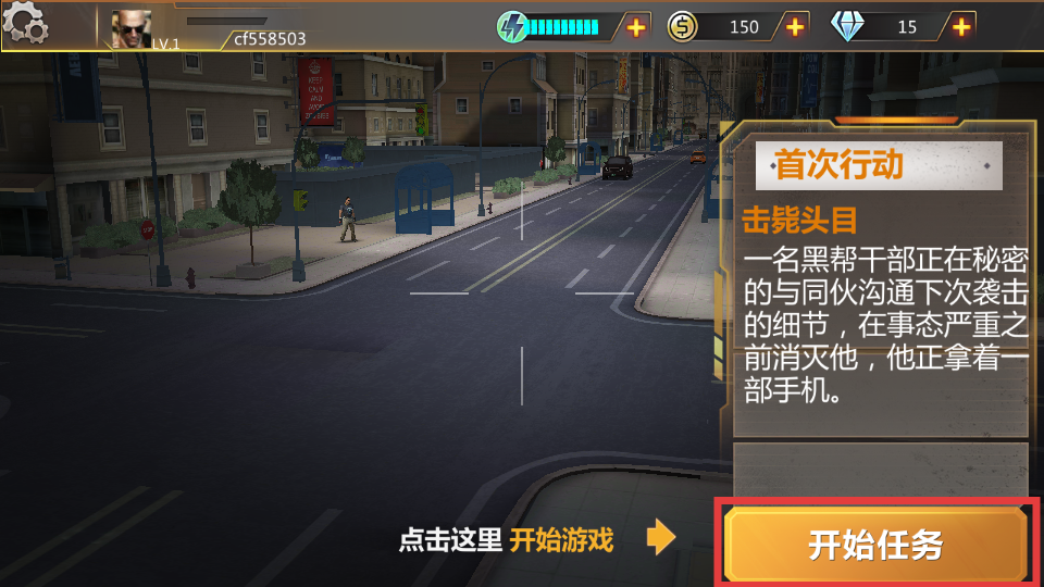 1、点击【开始任务】,进入“首次行动”,任务为消灭拿手机的黑帮干部,开启狙击。