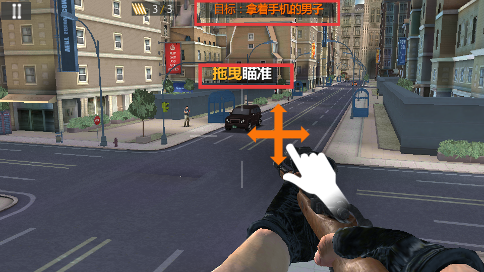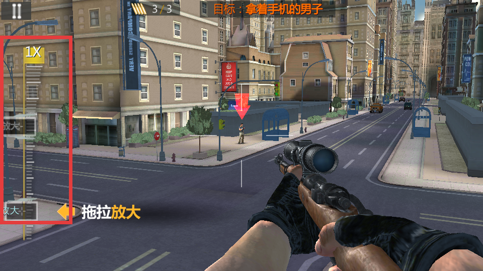 2、根据“拖拽瞄准”指引,拖动瞄准镜十字准星,对准【拿着手机的男子】,准备射击。