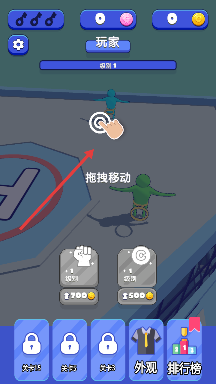 1、进入级别1,按照提示拖拽移动角色,开启格斗挑战,在场景中准备与敌人展开对战。