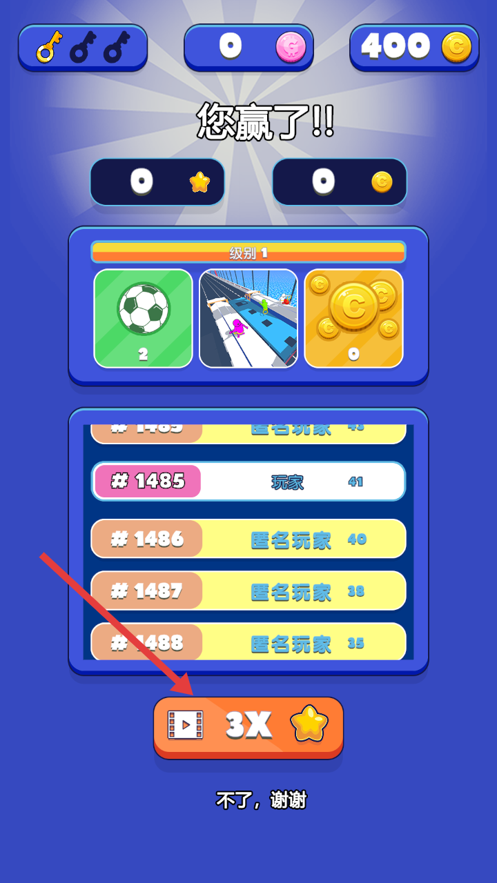 4、战斗胜利后,出现您赢了界面,可选择观看广告获取3倍奖励或直接继续,提升排名与奖励。