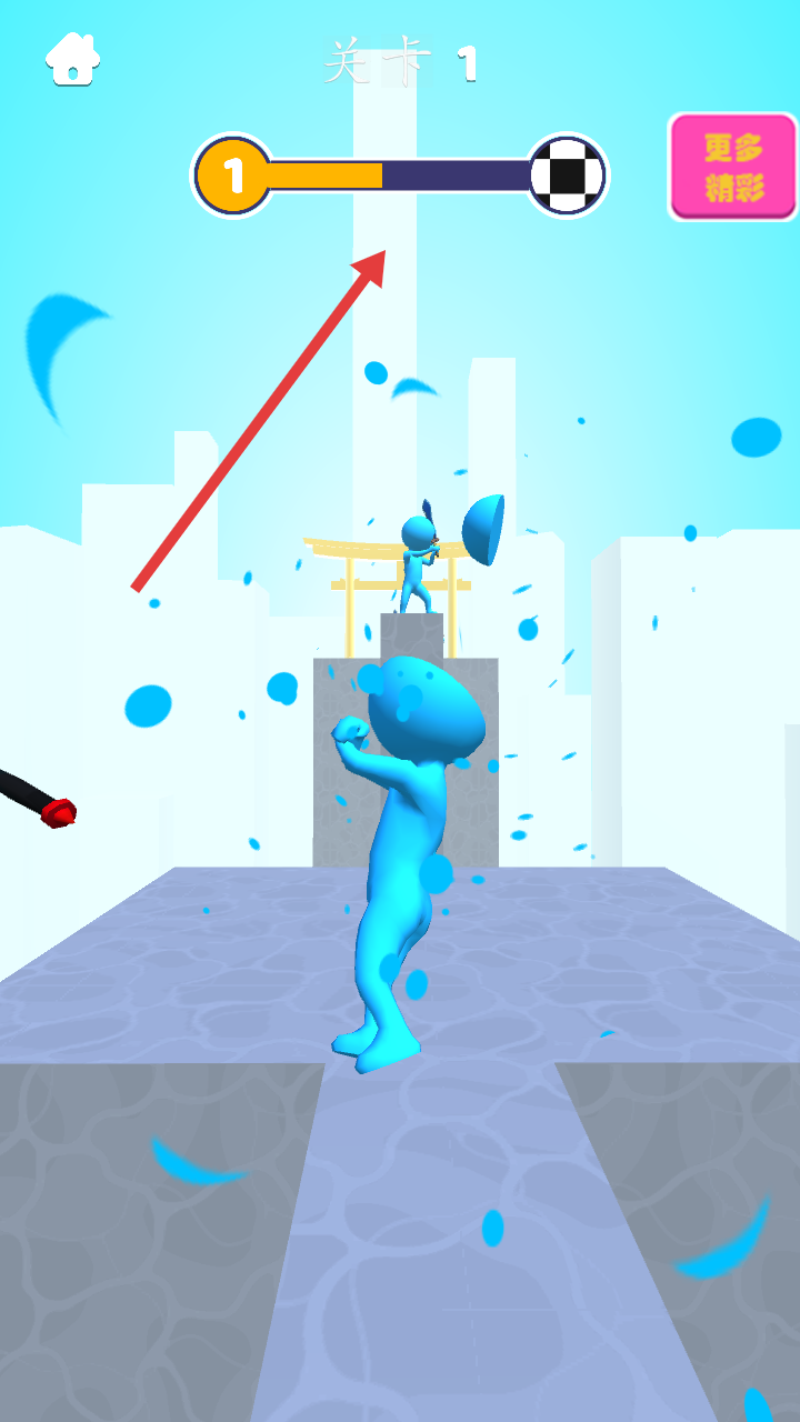 2、操控角色在跑道上前进,攻击沿途蓝色敌人,逐步推进关卡进度。