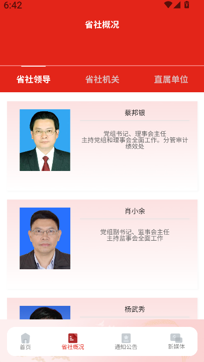 2、在功能栏目中可查看省社概况、领导介绍、省社机关及直属单位等内容,方便了解组织架构与业务职能。