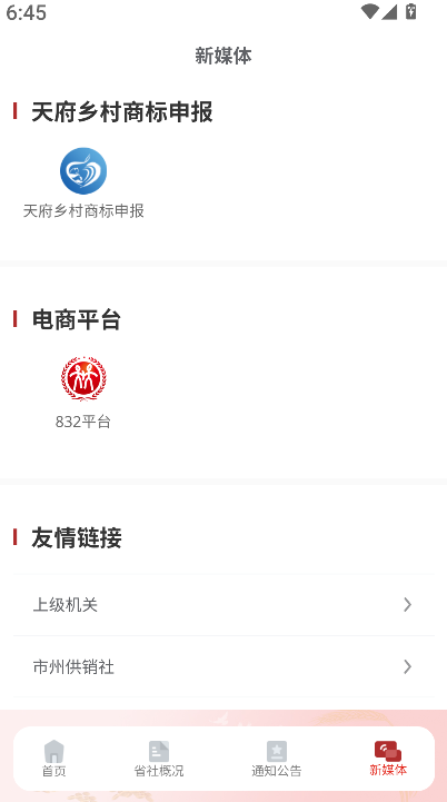 3、还可进入新闻媒体、天府乡村商标申报、电商平台及友情链接等模块,获取更多服务入口与行业信息资源。